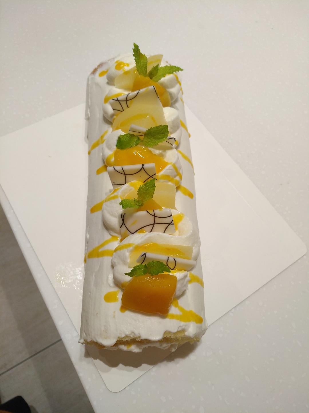 补图。夏天做的杨桃雪梨蛋糕芒果卷。味道不错。喜欢。原来外面那层奶油是用一张烘培纸收边的。新技能GET。