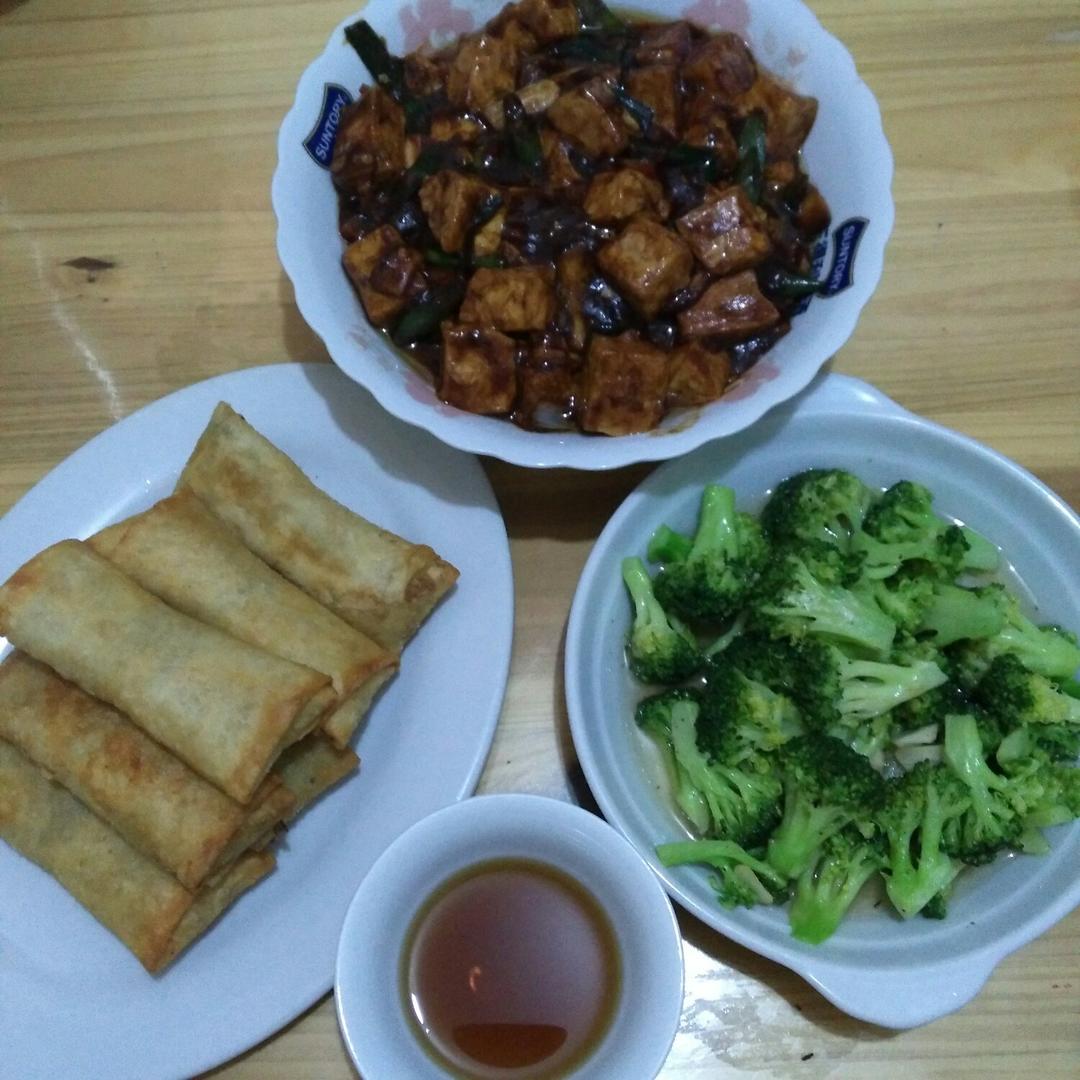 三鲜春卷,红绕豆付,清炒西兰花。