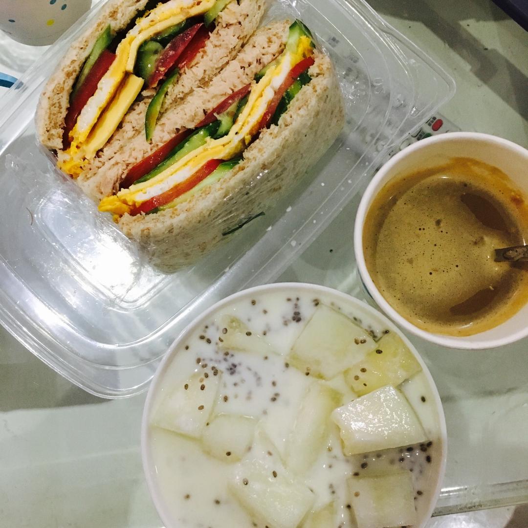 金枪鱼芝士蛋三文治,蜜瓜酸奶,脱脂拿铁