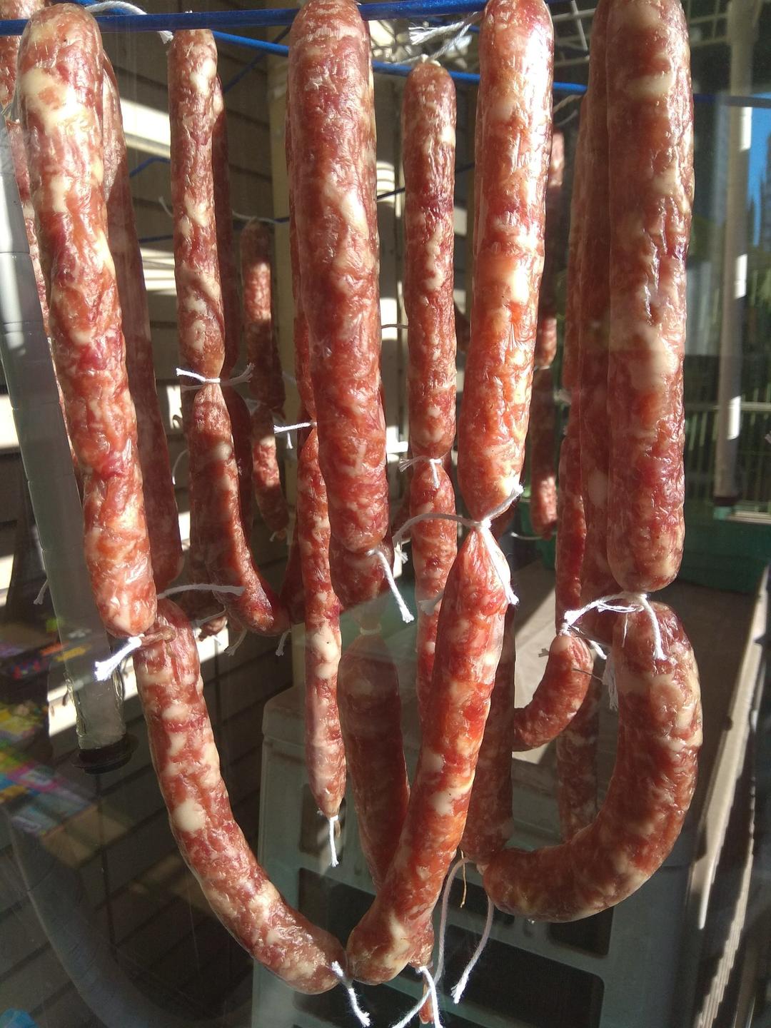 吃货喵666 做过 Q弹多汁的自制台式脆皮肠——绝对秒杀市售 风干肠,用这方子改了一下,肥瘦28开,饺成大颗粒,1斤肉,10g盐,两小勺酱油,5g糖,玉米淀粉15g,蜂蜜5g,五香粉1g,料酒一小勺,耗油一勺。冬天室外风干两天,盘子底下铺一层豆腐皮,戳洞,蒸20分钟。室外凉一天。 2017-12-18