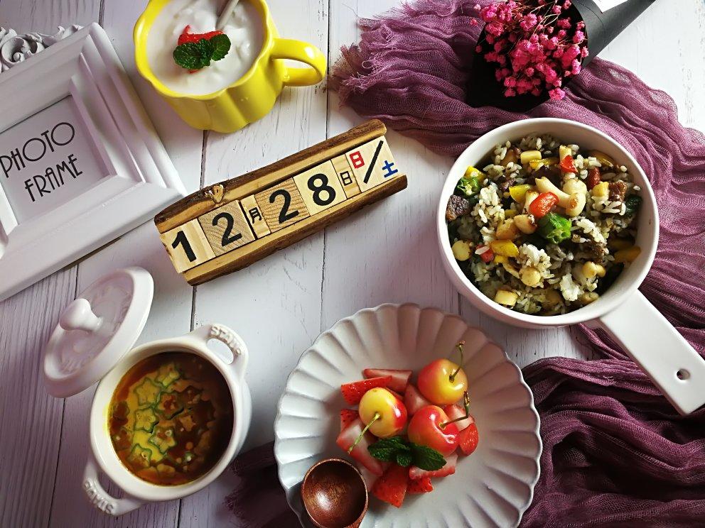 【食•记】牛肉粒鱼肠炒饭,果盘,酸奶,黄秋葵蒸蛋!