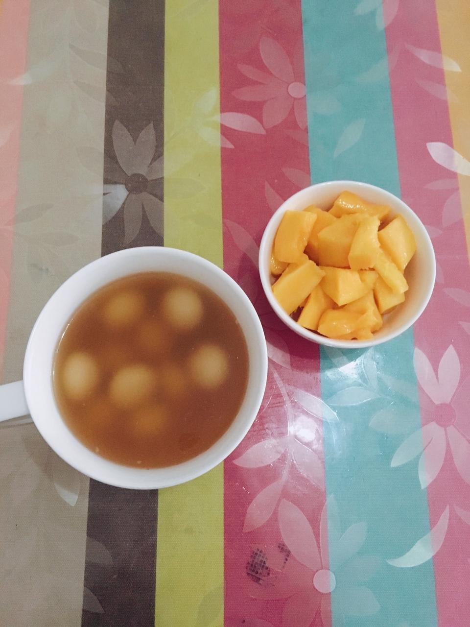 小鹿食馆 做过 早餐•2018年1月3日 红糖姜汤煮花生汤圆西米露+芒果(买的汤圆内馅比较甜,所以煮汤水少放糖,搭配着吃,倒也刚刚好,还有一丝丝姜的辛辣) #早餐•2018年1月3日# 2018-01-03