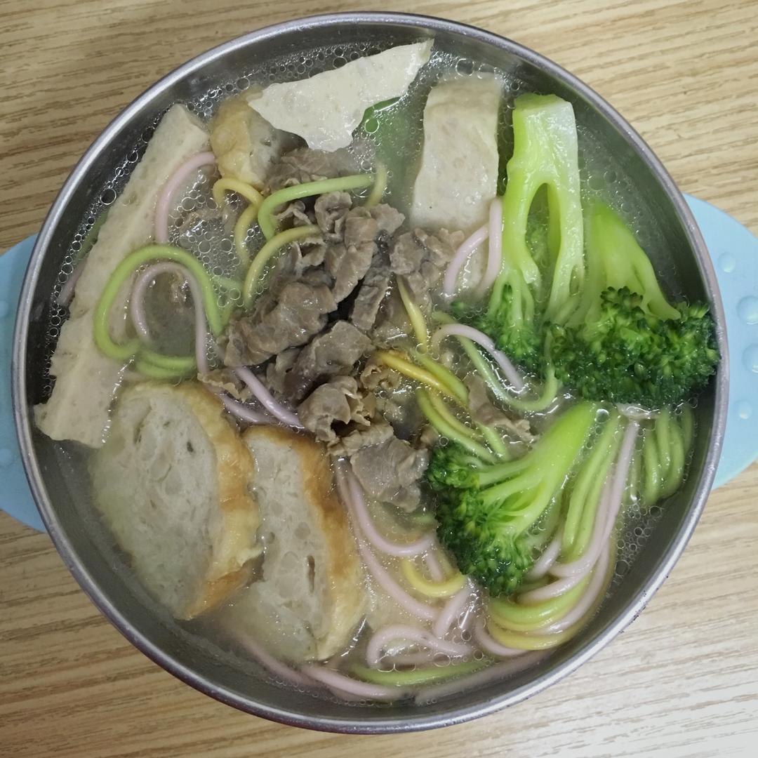 牛肉汤底,果蔬面和西兰花,肉饼肉卷,加牛肉片~宝宝的中午辅食~
