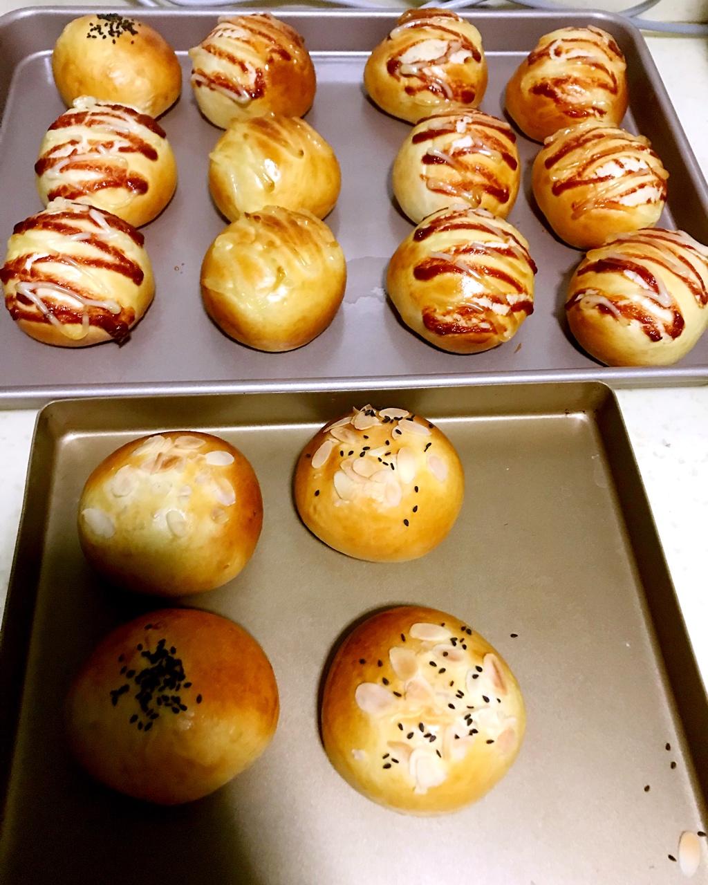 把量翻倍,吐司改做小面包...挤了番茄酱和沙拉酱,还有芝麻和杏仁片的...配方真的很赞...面包的里面的组织很赞...