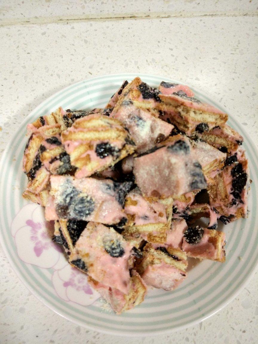 没有纯白绵花糖,粉粉的也挺可爱,就是太甜腻了,幸亏我用的老寿星葱油饼干,压了下甜味,但饼干易碎。