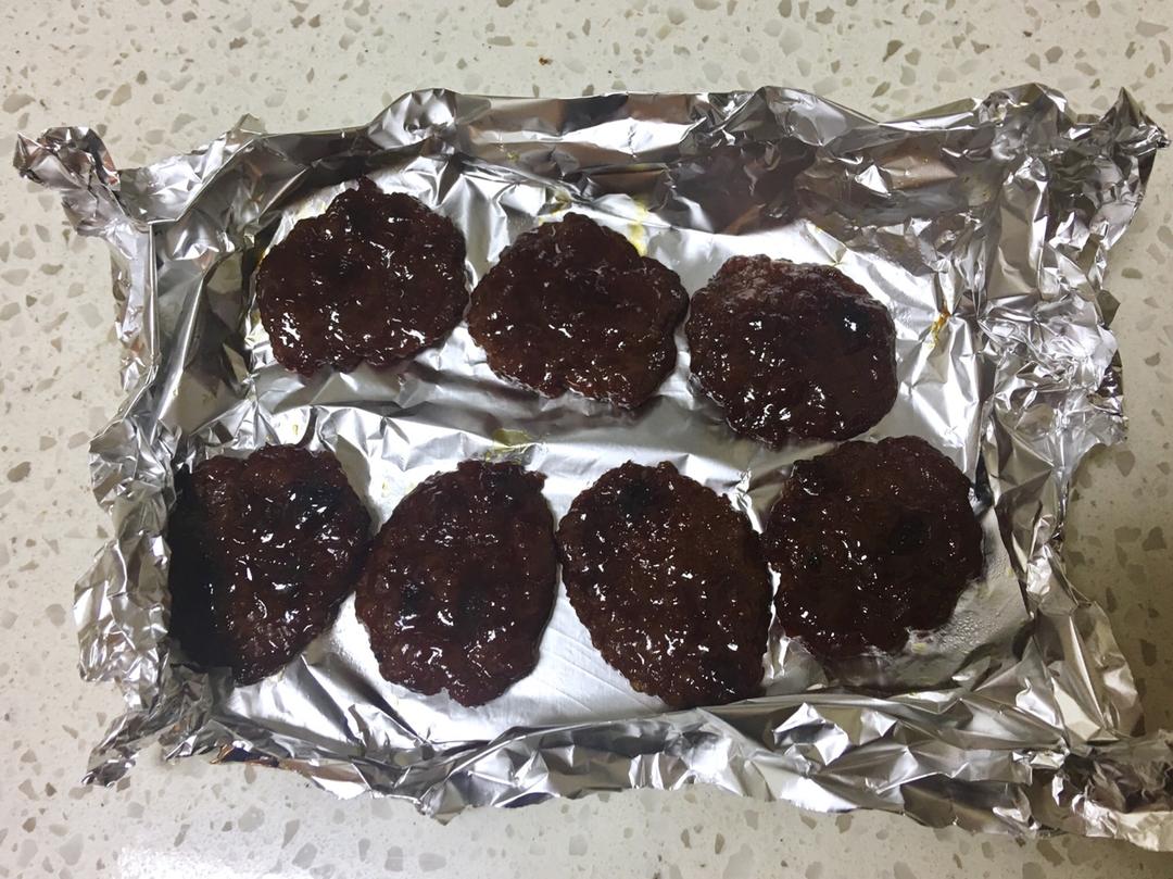 没用叉烧酱 剩下的肉不够做一张肉脯了 团成肉饼烤一下 180度15分钟刷蜂蜜水 又烤了15分钟~ 没糊 嘻嘻嘻