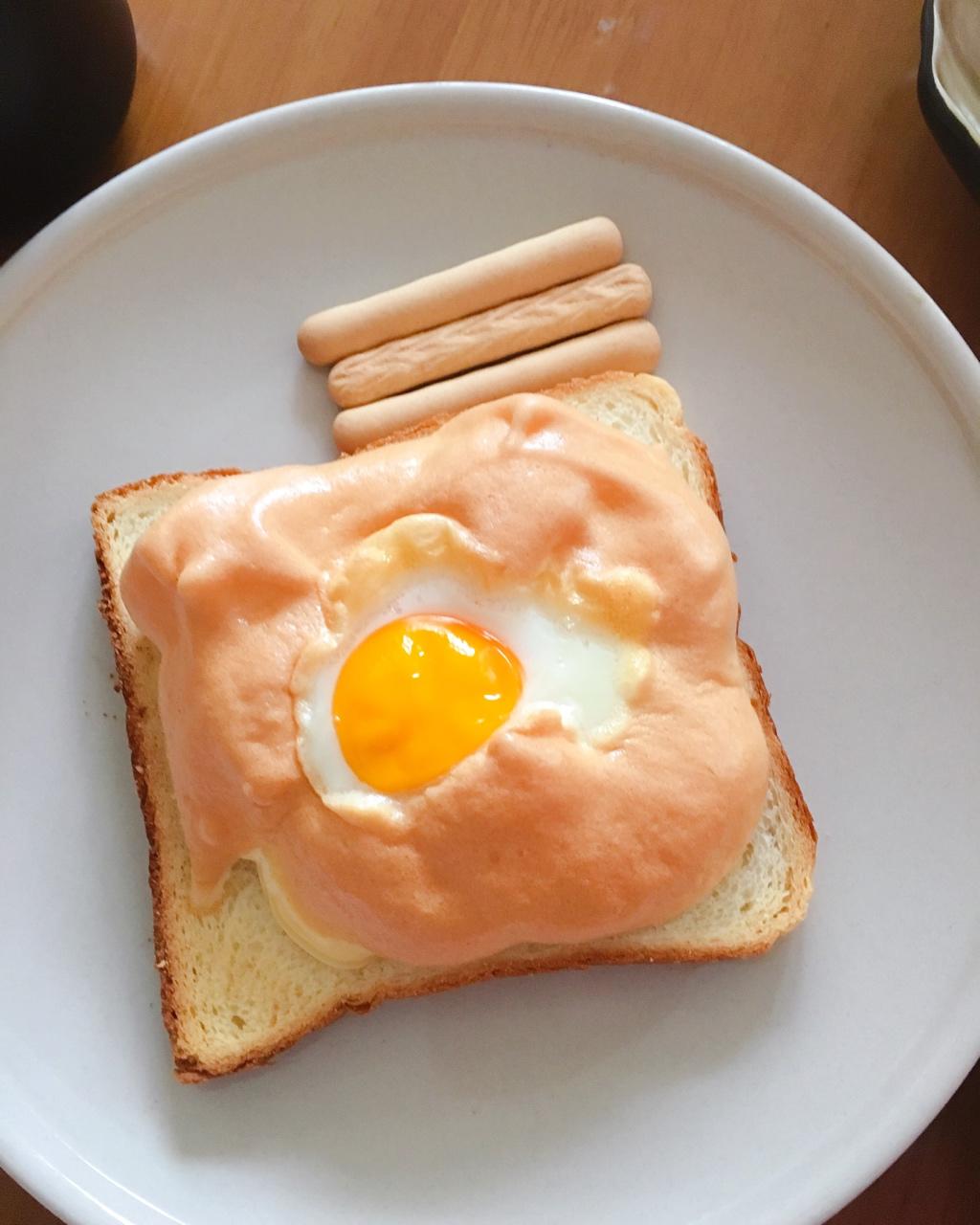 至少多烤了十分钟,蛋黄勉强熟了,但是吐司已经很脆了,蛋白也变晚霞了,还是好吃😋