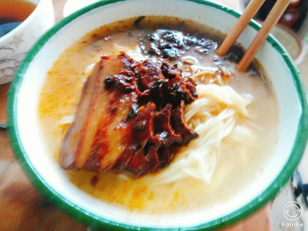 #午餐•2018年2月9日#中午下班回到十楼,已经很晚了,错过了吃饭时间,下楼到超市里转悠,不知道吃什么,买了盒鲜面,看了标价才一块九毛,然后看到美食吧有好多的熟菜,竟然有小盒装的扣肉,想着如果煮一碗面,把扣肉拌里面去,该会多好吃啊!