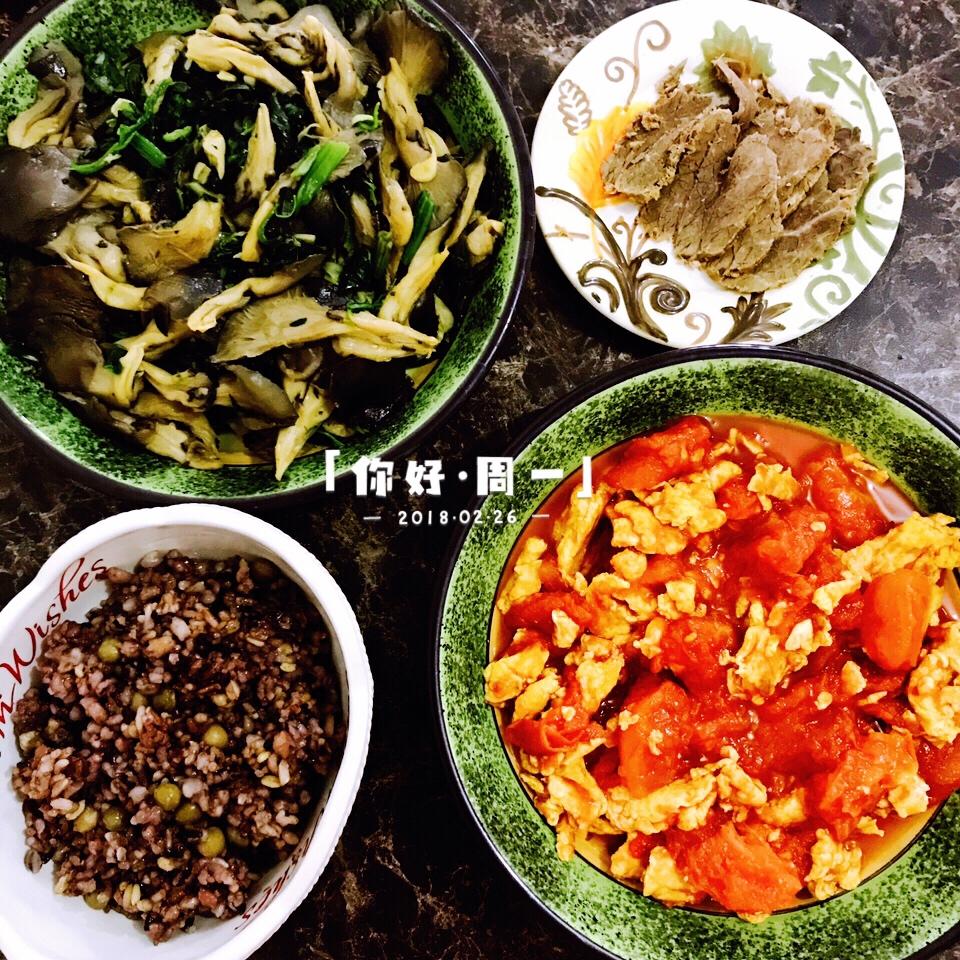 杂粮豌豆饭+无油平菇菠菜+无油鸡蛋西红柿+酱牛肉