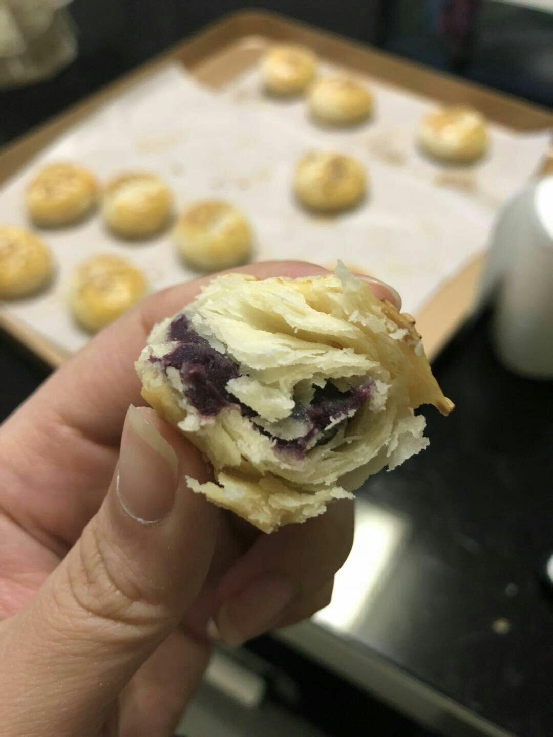 尔东小不点 做过 老婆饼 做了紫薯馅的,馅放少了不够甜但是很酥,一边吃一边用手接着掉下来的渣,感觉油皮里还可以多放一点水或者猪油,到最后醒发包馅的时候皮有点硬很怕破了油酥全露出来,我是按克称的,一个饼里放了15克馅,下次可以再加5-10克,馅不能太湿 2018-03-05