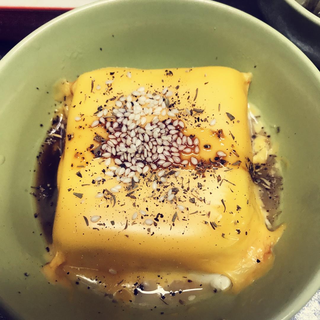 半块豆腐,一片芝士片,没有肉松用芝麻代替,还放了些百香叶