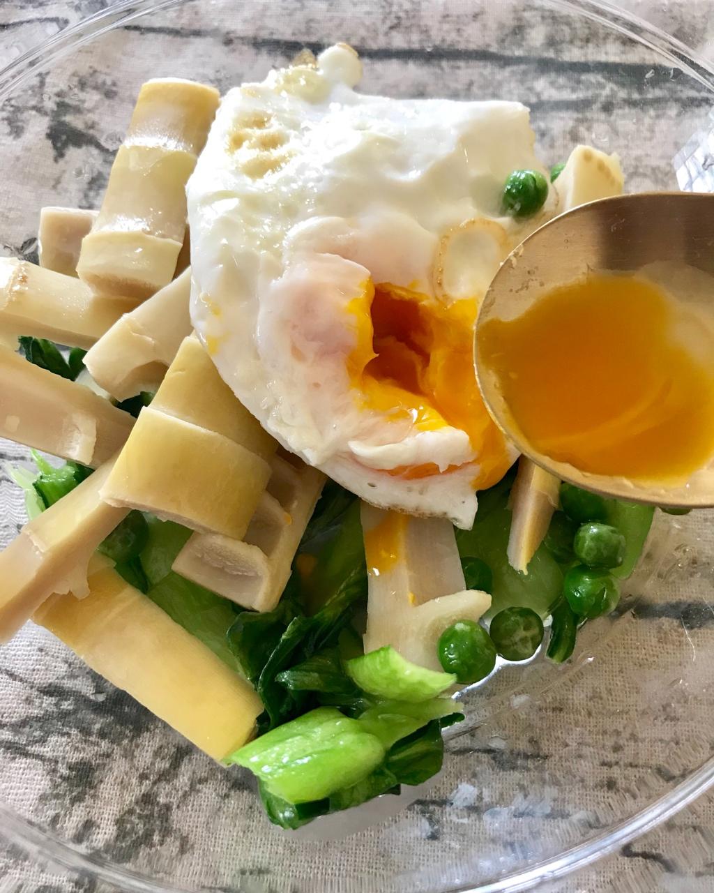 转基因萝莉 做过 午餐•2018年3月9日 适合春天吃的菜第一步,青菜炒熟,倒出。第二步,春笋加苹果醋煮熟,过冷水。第三步,煎鸡蛋和豌豆。 #午餐•2018年3月9日##溏心蛋美食# 2018-03-09