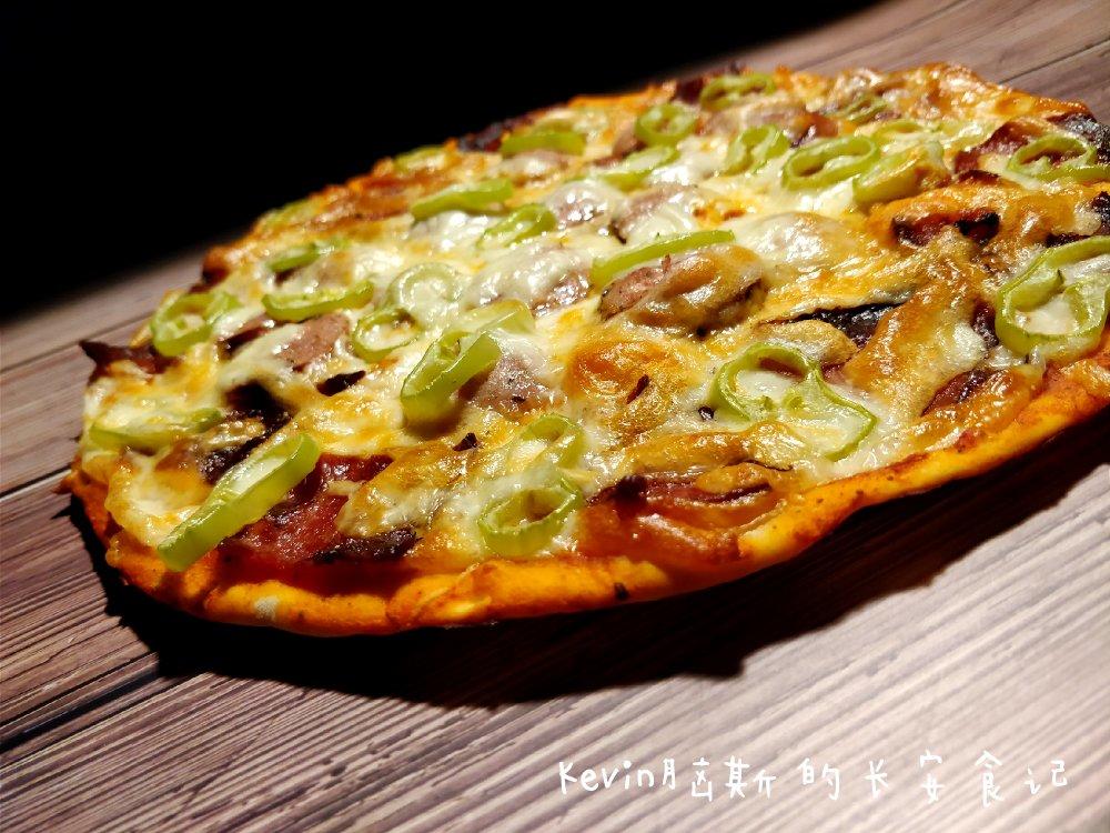 意式薄脆,比普通的披萨要薄而且还脆脆的,我加了罗勒香肠和培根~