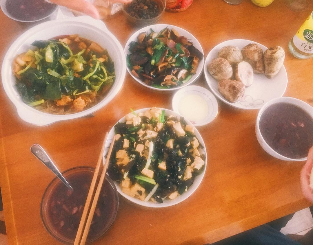 是Bo不是波啊 做过 午餐•2018年3月16日 今日午餐:黑白菜猪肉炖粉条➕蒜苗香菇炒香肠➕香葱木耳丝炒豆腐➕毛芋头蘸炼乳➕五谷杂粮粥,拉着全家吃杂粮,好吃又健康! #午餐•2018年3月16日# 2018-03-16