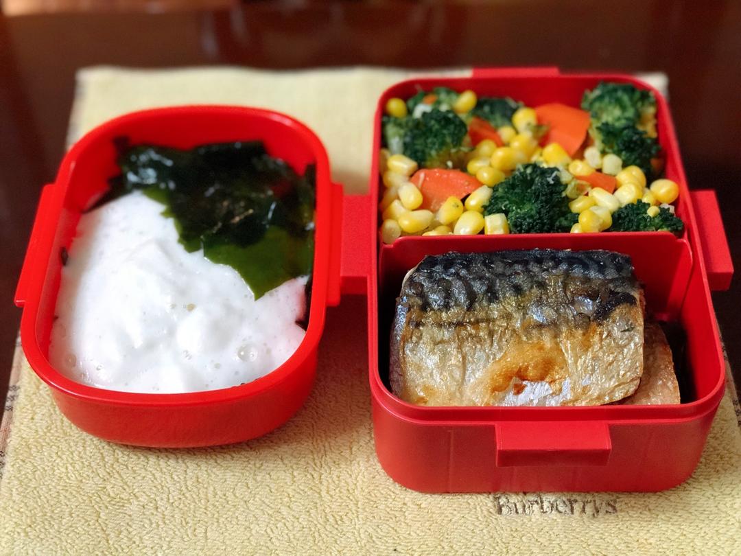 今日便当: 盐烤青花鱼🐟+味噌干捞杂蔬+裙带菜拌山药泥+粑粑柑一只(未出镜)🍊~