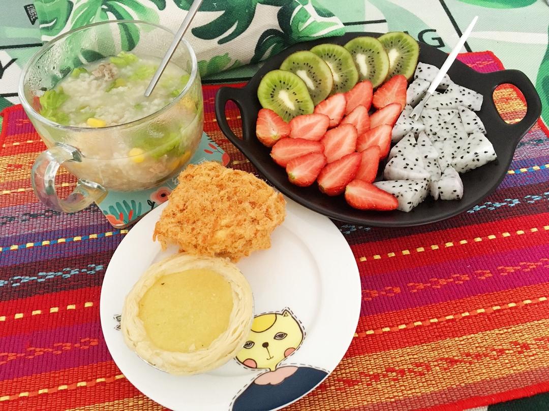 好想_做只猫oo 做过 午餐•2018年3月23日 早饭10:50瘦肉粥(猪肉丝、姜丝、玉米粒🌽、豌豆粒、生菜碎、干贝),鲍师傅肉松小贝、小玲烤的椰挞、水果拼盘(草莓🍓、猕猴桃🥝、白心火龙果)其实吃的是早餐,不过已经11点了…… #午餐•2018年3月23日##早餐•2018年3月23日##🌵再看我就把你吃掉🌵# 2018-03-23