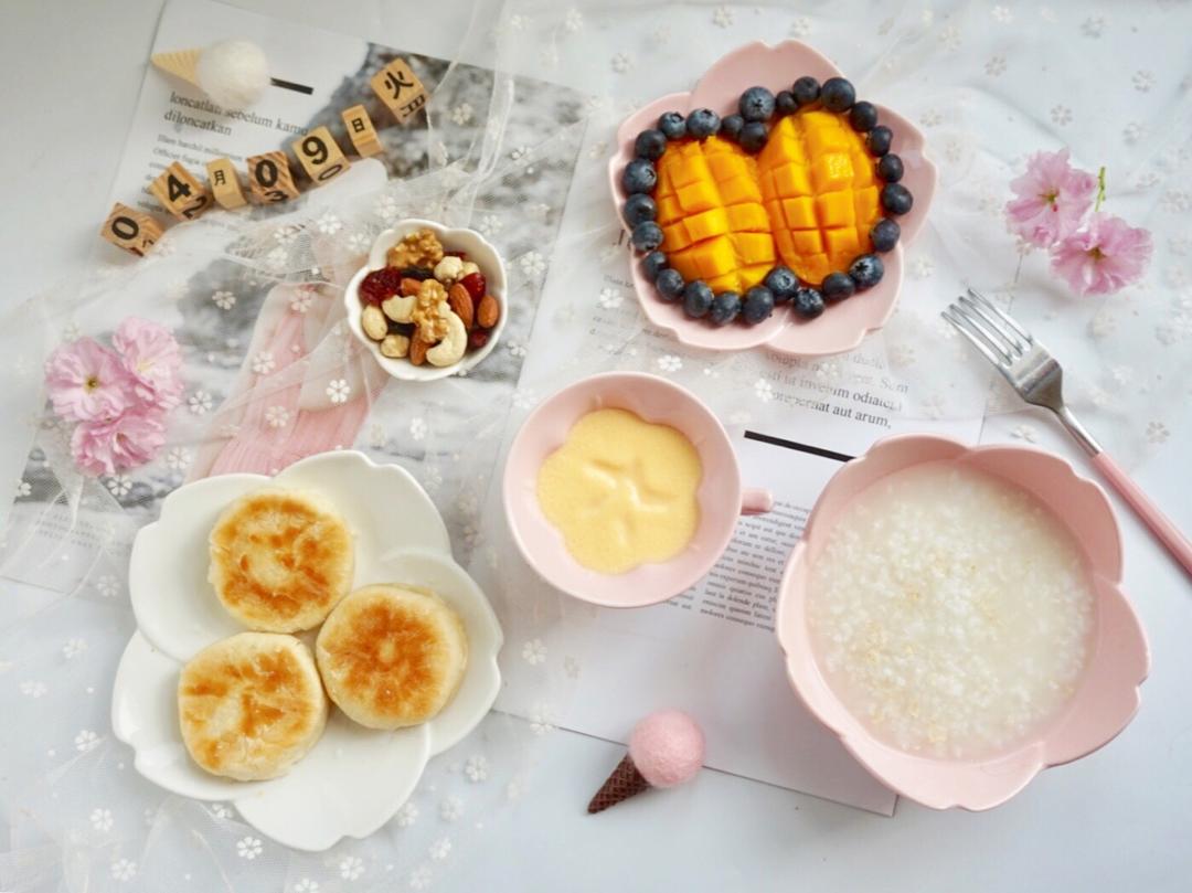 绿豆饼+燕麦粥+鸡蛋羹+芒果+蓝莓+每日坚果
