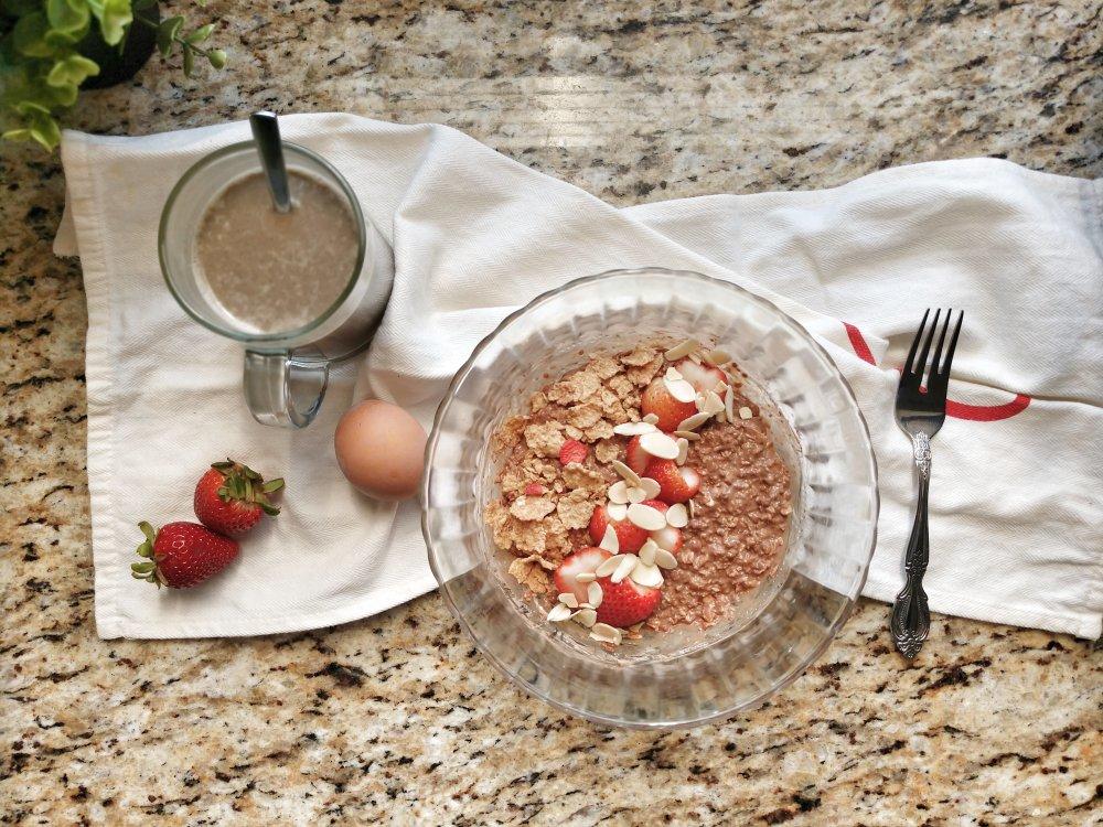 #早餐•2018年4月10日#草莓巧克力隔夜燕麦,黑豆浆(红枣,芝麻,杏仁),水煮鸡蛋