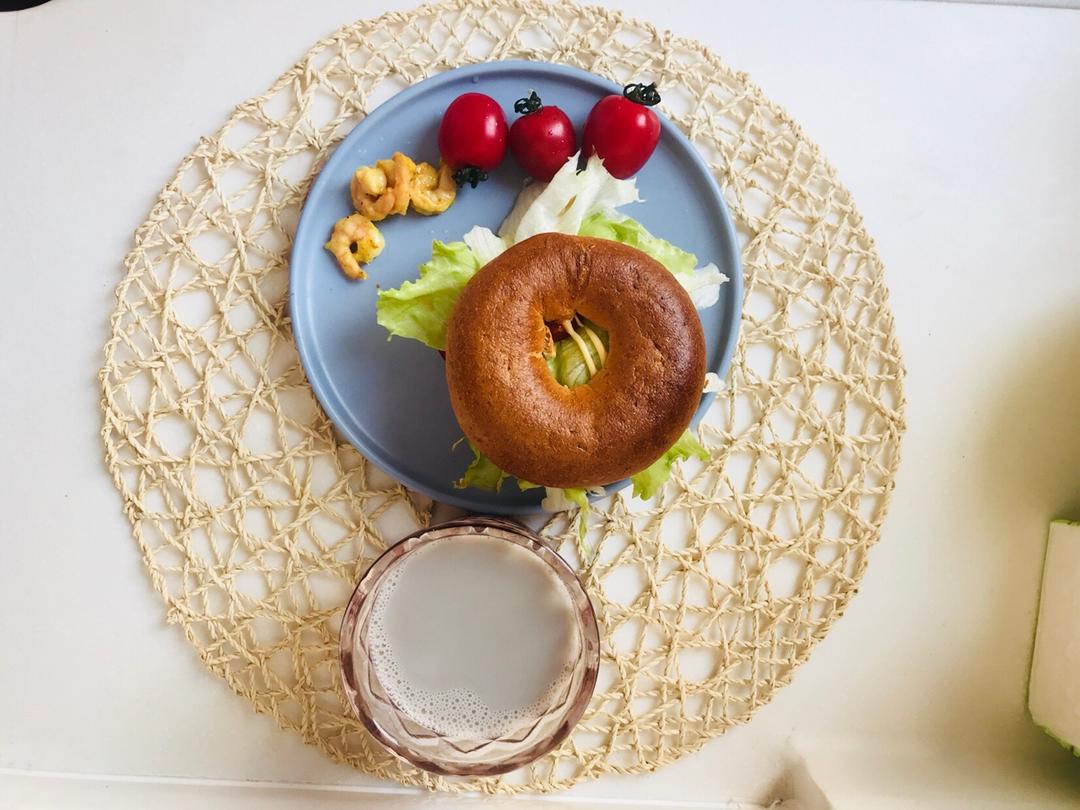虾仁生菜贝果。黑豆浆。