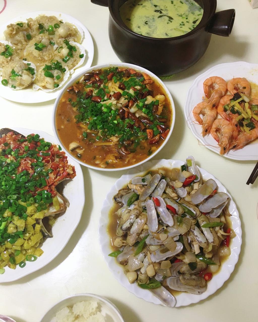剁椒鱼头,水煮鱼片,蒜蓉粉丝扇贝,辣炒蛏子,油爆大虾,黄辣丁鱼汤
