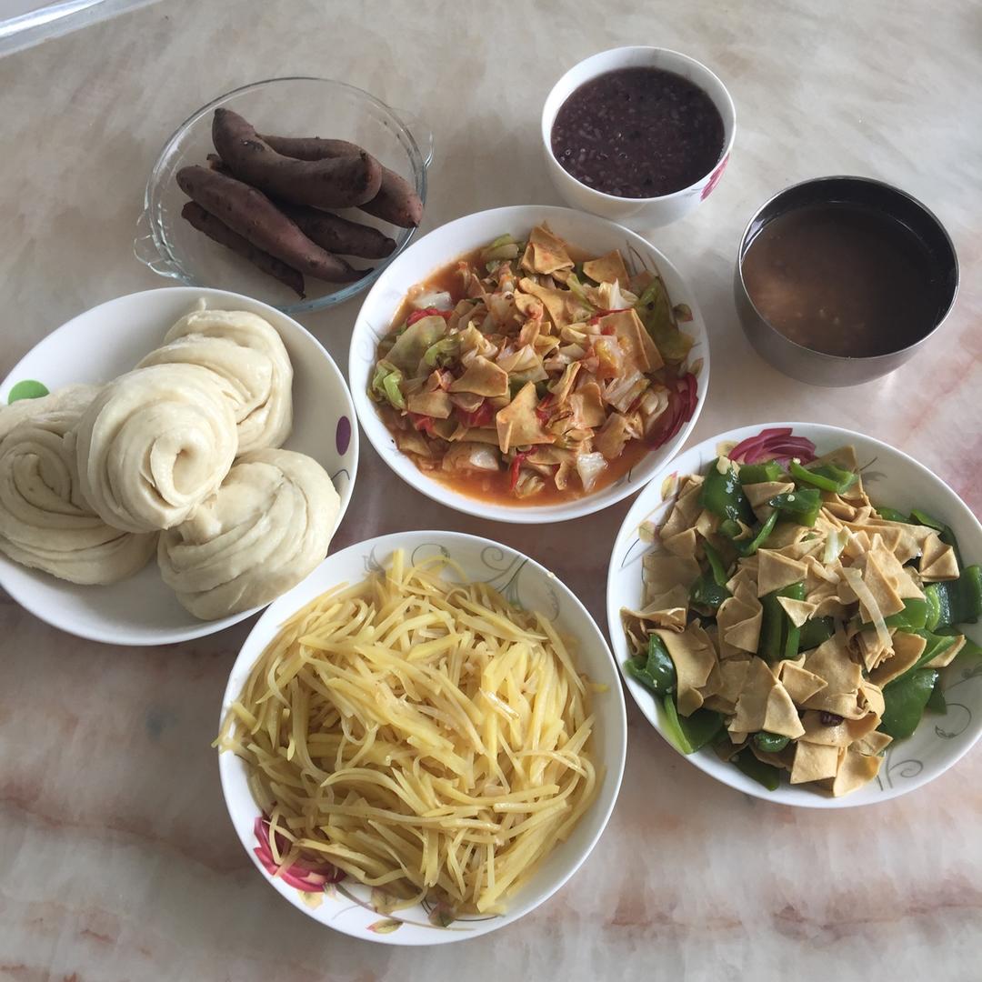 小小嘴角上扬 做过 午餐•2018年5月21日 昨天藜麦粥打成米糊加酵母跟面粉来发酵来蒸花卷,红薯🍠,焦三仙粥,黑米藜麦白米粥,西红柿炒圆白菜加豆片,尖椒豆片,醋溜土豆丝。 #午餐•2018年5月21日##纯素宝宝辅食##纯素# 2018-05-21
