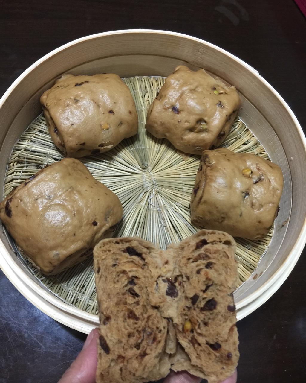 这方一次一笼6个,出炉就消灭一个半。开心果替代核桃仁,葡萄干替代枸杞。满分方子👍请教各位,是不是发过了点,表皮下有大气泡?