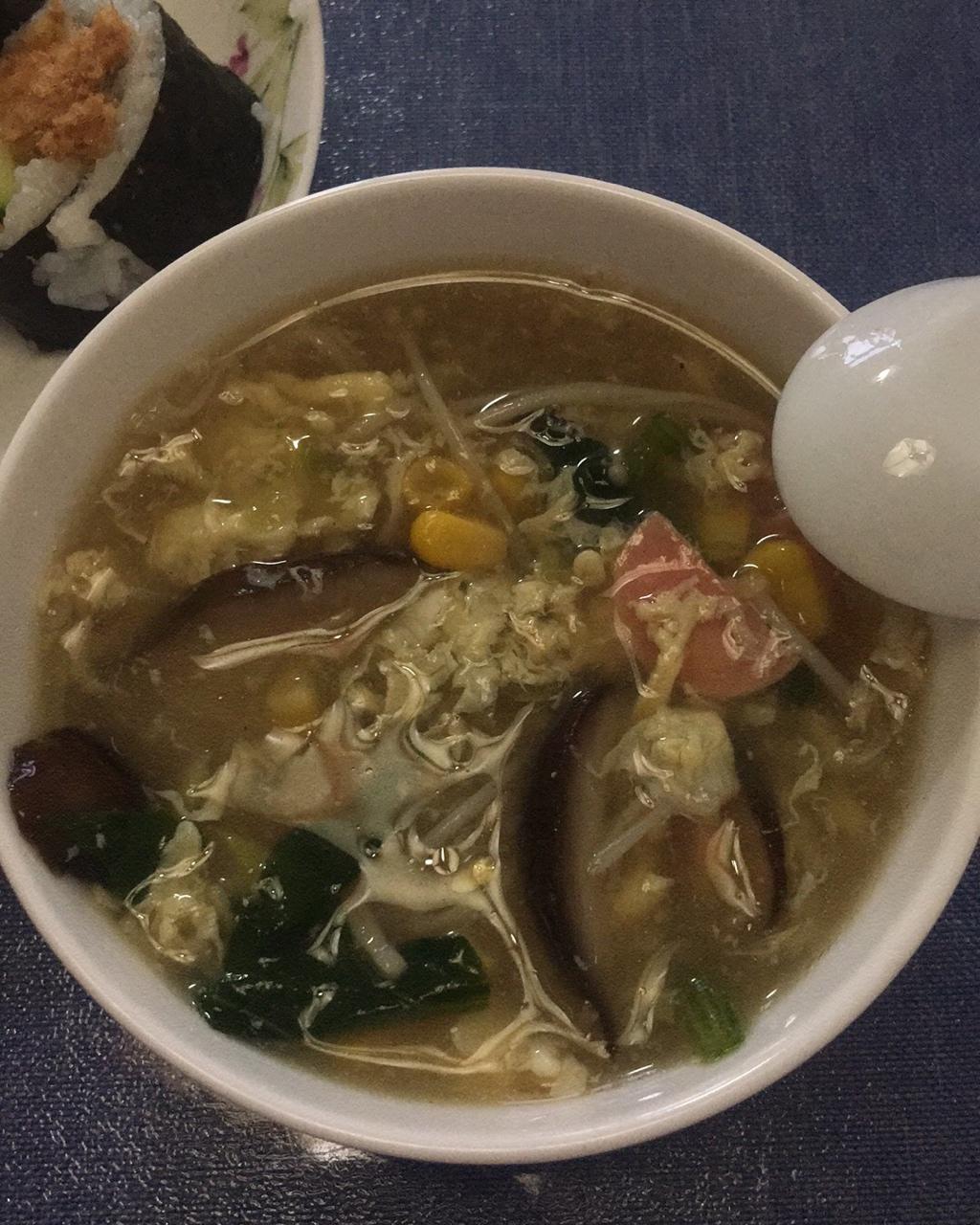 我用的金针菇,里面加了一点菠菜,甜玉米粒儿和几片火腿肠,汤少了,不好看,但味道还是很好吃啊,没想到我也能做出这么好喝的汤,谢谢分享