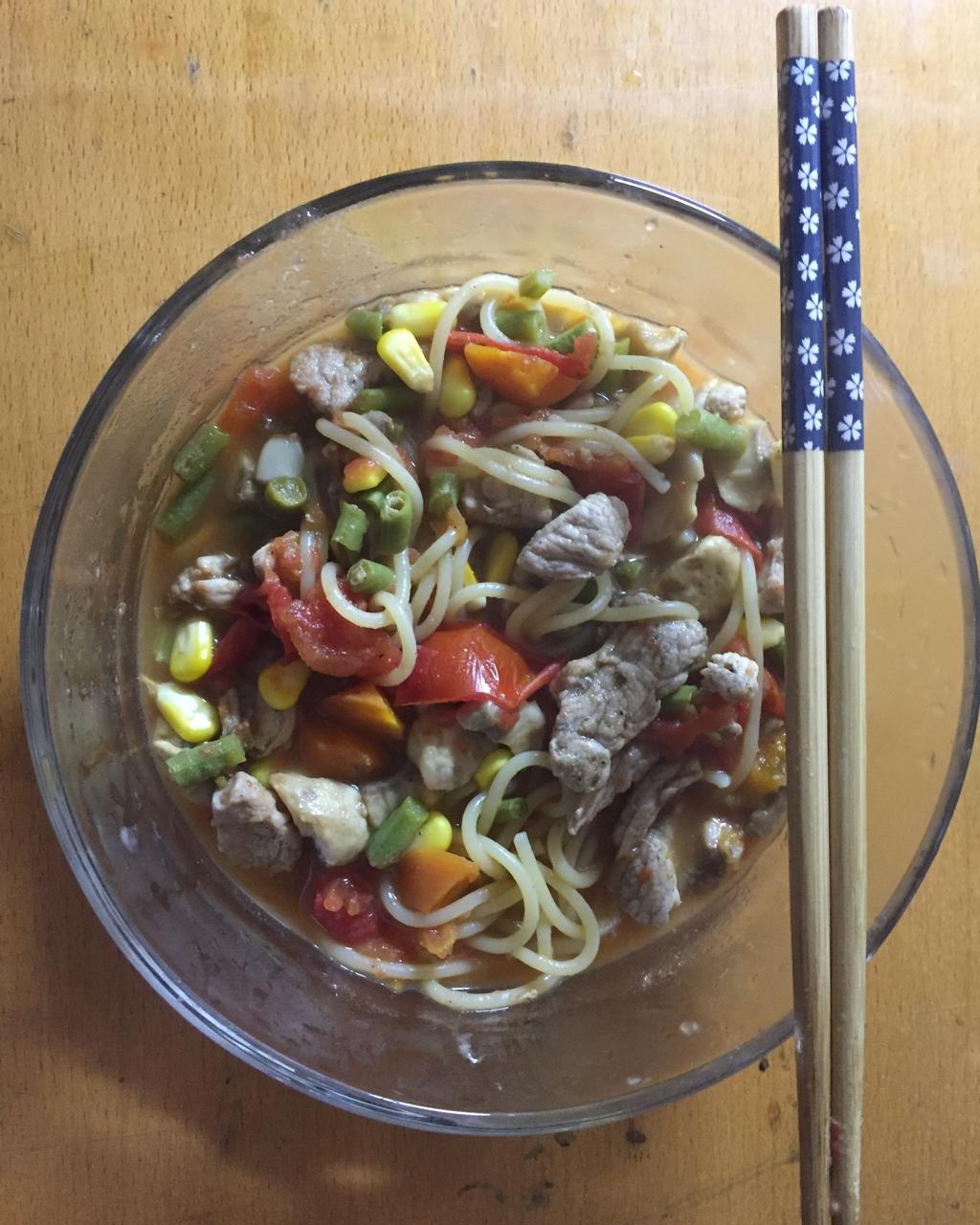 eha 做过 午餐•2018年6月3日 炖菜+意面玉米 豆角 番茄 胡萝卜瘦肉这次煮的意面格外好吃水开了煮了5min 然后放出来等菜快闷熟 放进去在焖个3min 非常劲道 #午餐•2018年6月3日##减脂餐# 2018-06-03