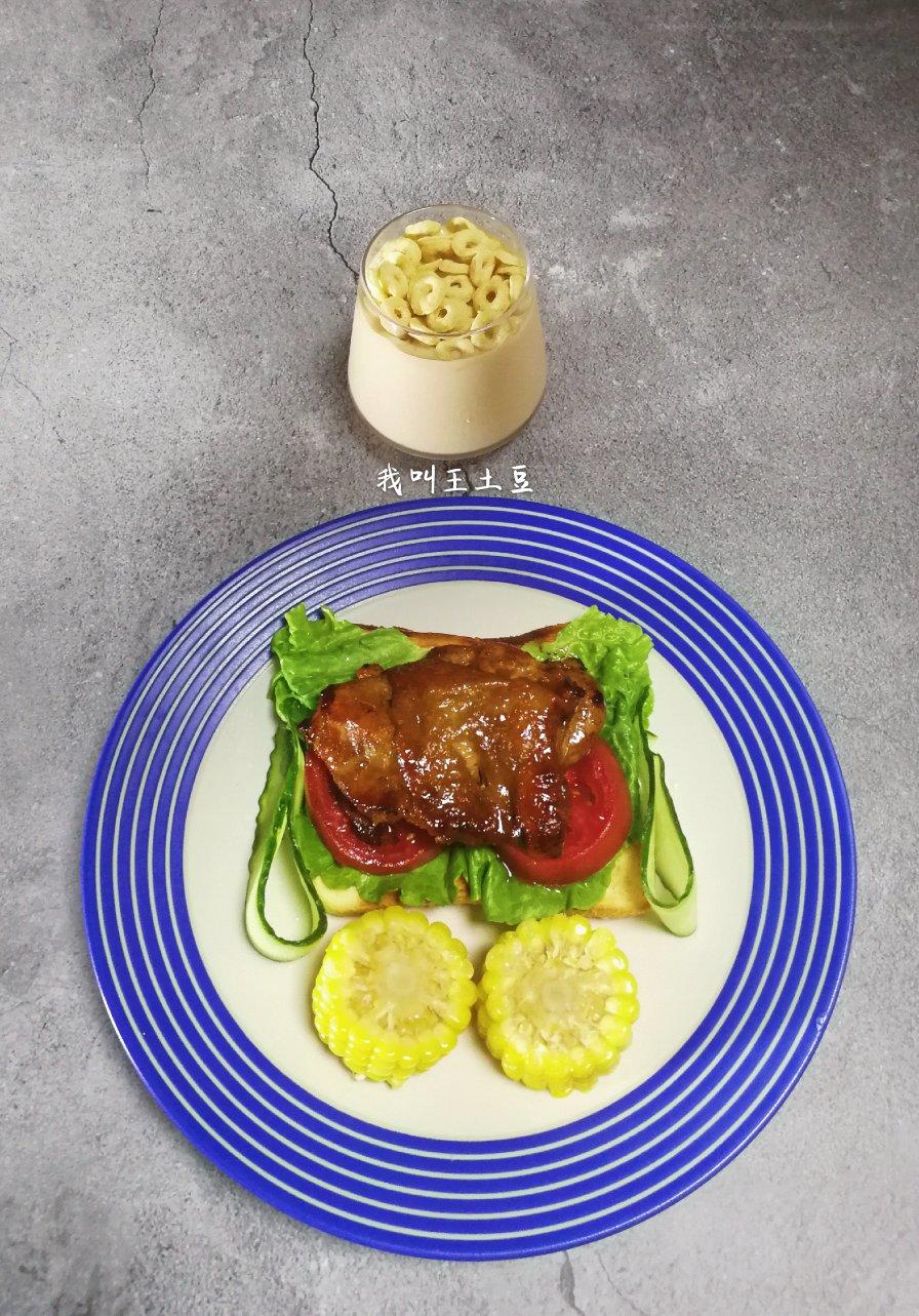 女儿的早餐:照烧鸡腿三明治,甜玉米,酸奶麦片!