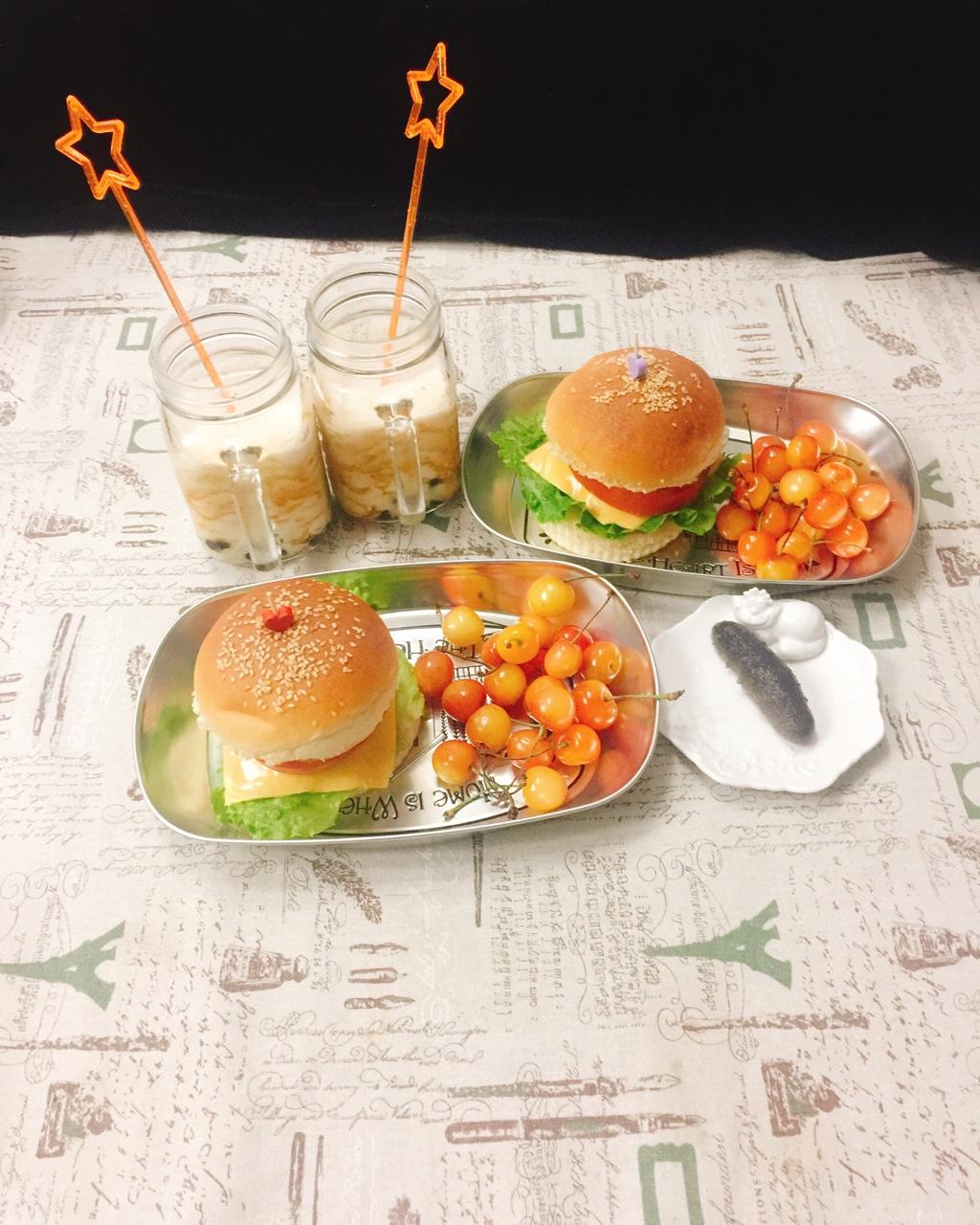 早安!自制汉堡包(生菜、萝卜丝肉糜饼、芝士、番茄、荷包蛋)、黑糖鲜奶珍珠奶茶、水晶樱桃!