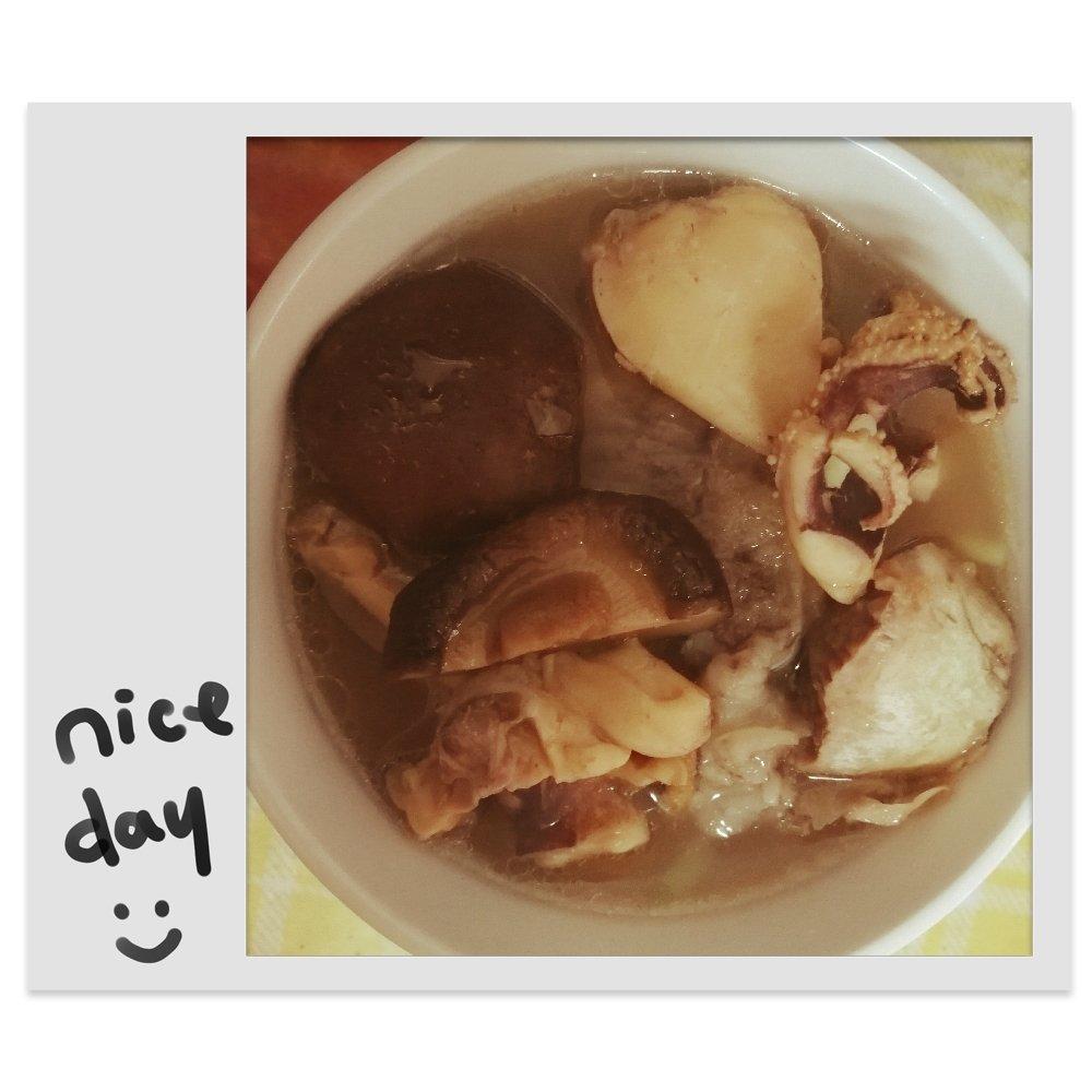 墨鱼排骨汤,放了香菇要好喝点。生小孩的时候老妈经常煮给我喝,可以催乳,亲测有效☺