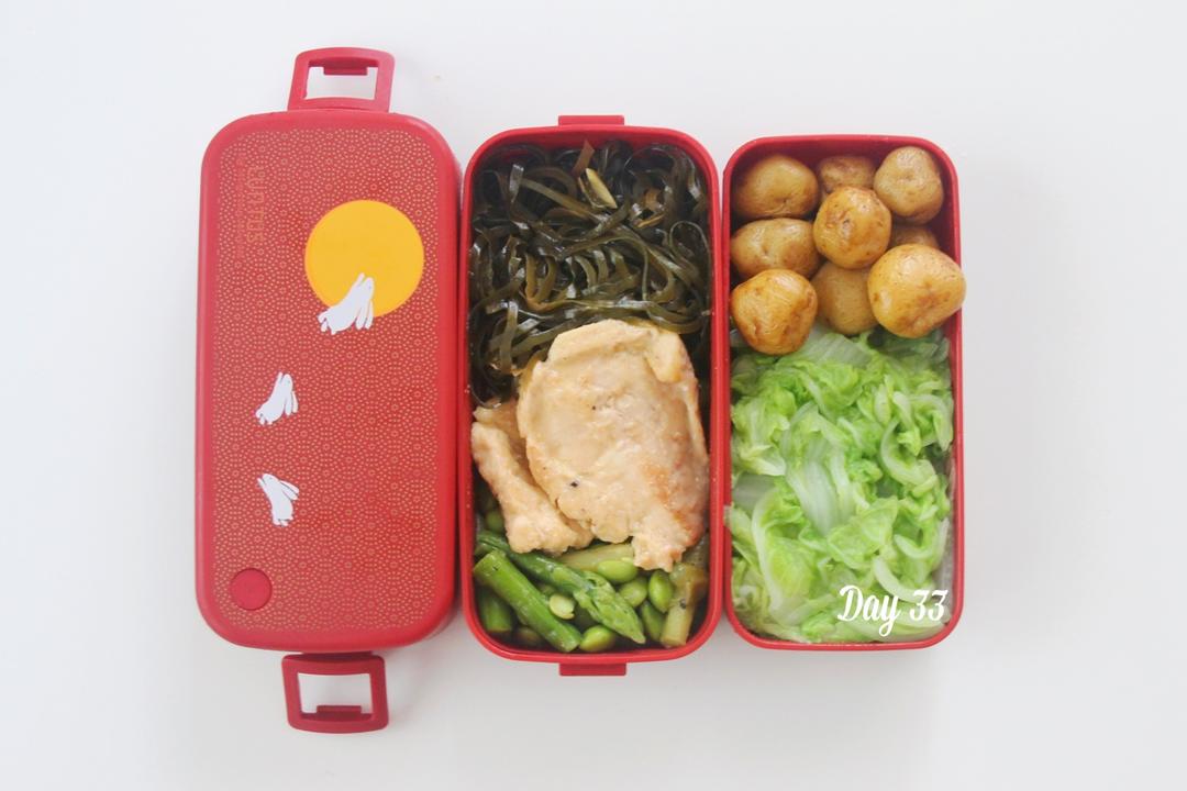 橙香鸡胸肉,凉拌海带,毛豆芦笋乱炒(ーー;),水煮本地土豆,水煮白菜