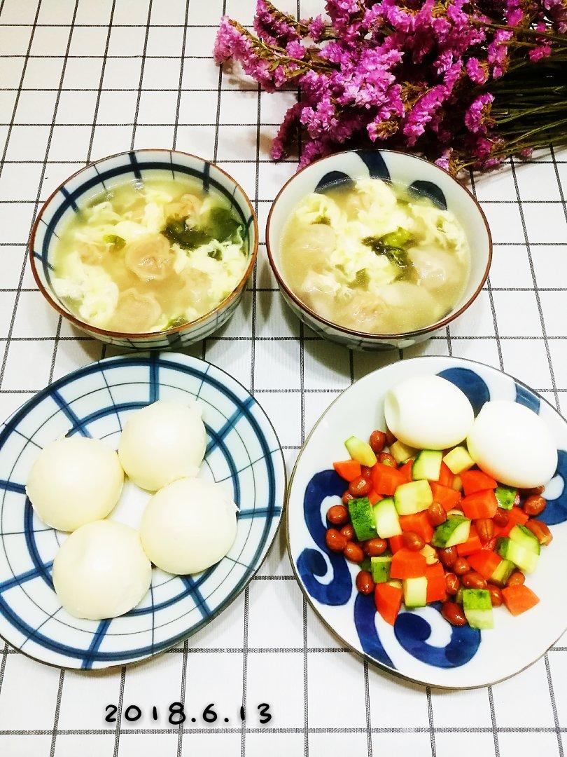 早安!二牛今日早餐:豆沙包、煮鸡蛋、凉拌菜和鸭汤云吞。