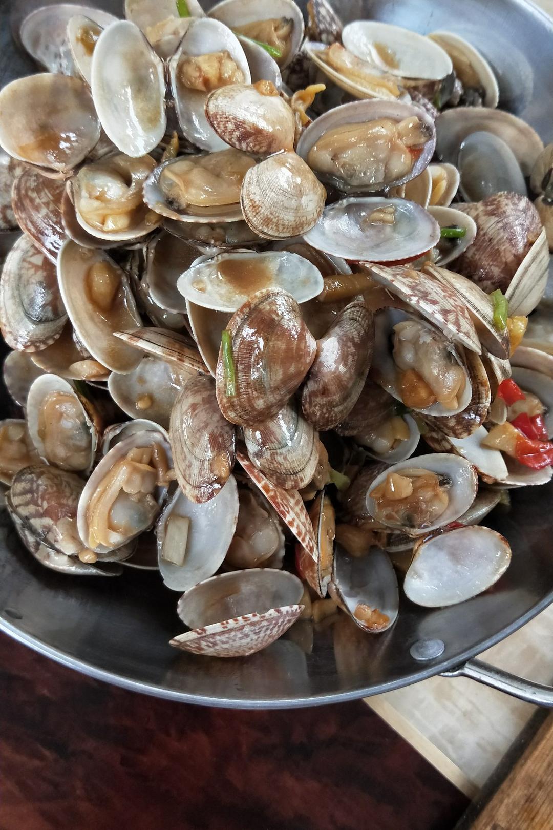 然后开火放油放姜葱蒜辣椒爆香,倒花甲翻炒两次加入:料酒、生抽、酱油一点点、醋一点点、耗油以上除了一点点的都正常炒菜的量~【不要放盐,不要放盐,不要放盐】全部炸开,放葱花,翻炒两下出锅.