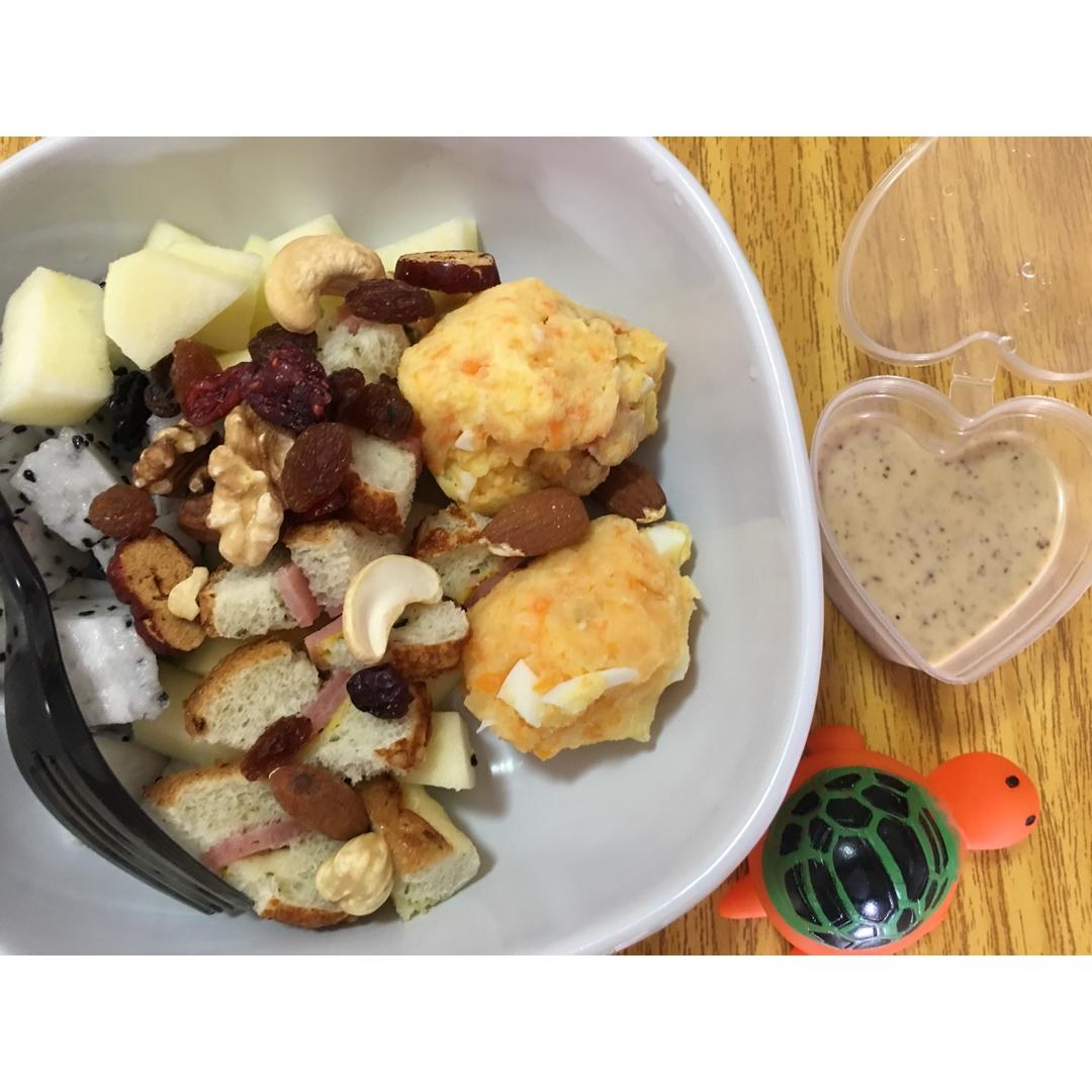 好像萝卜下多了,但是不影响口味,加了盐、黑胡椒、虾仁,味道杠杠滴~推荐用芝麻酱,这样一盘沙拉🥗不爱吃的家人都吃完了