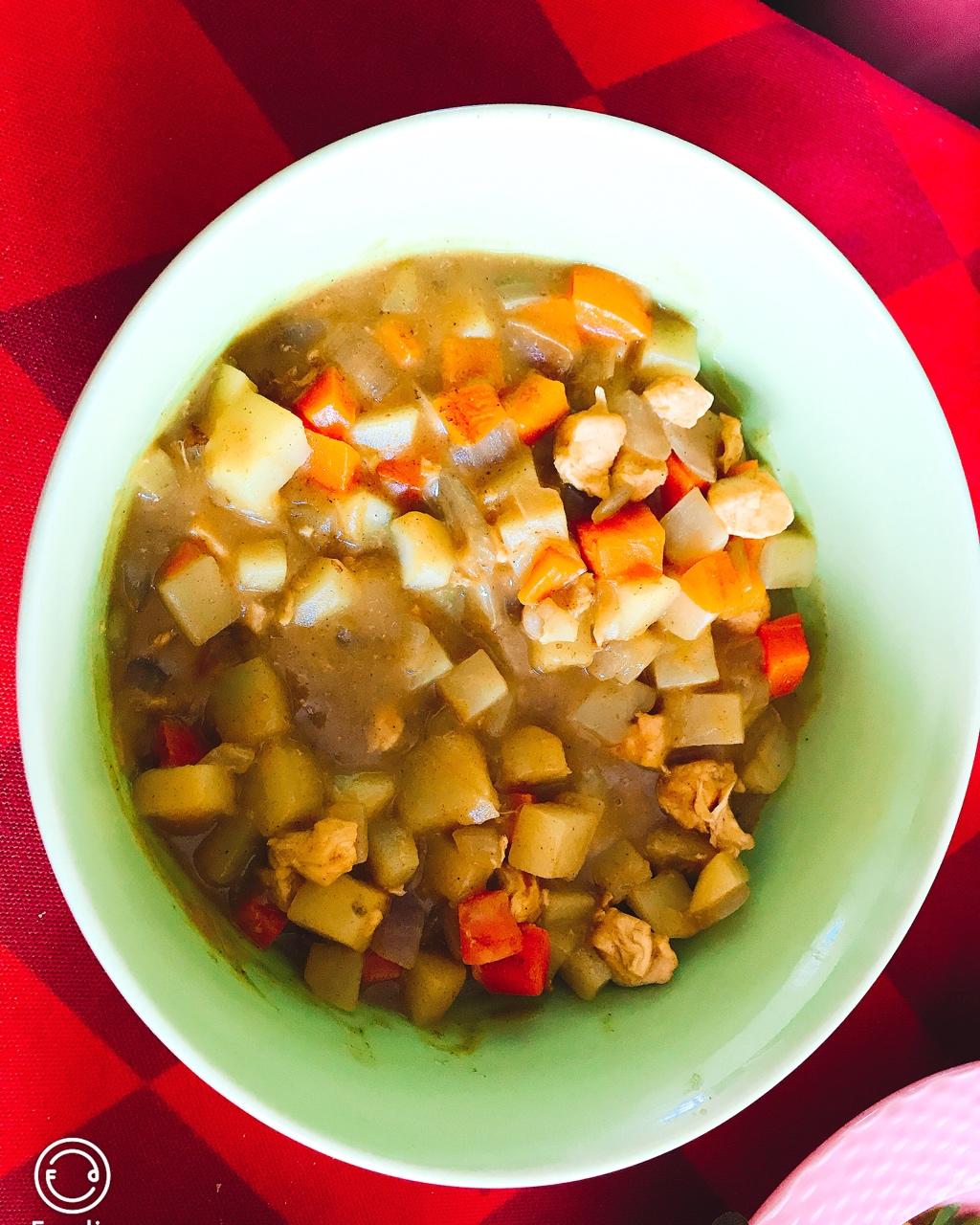 咖喱鸡肉(娃不吃)、丝瓜炒蛋、红烧平鱼、杂粮米饭