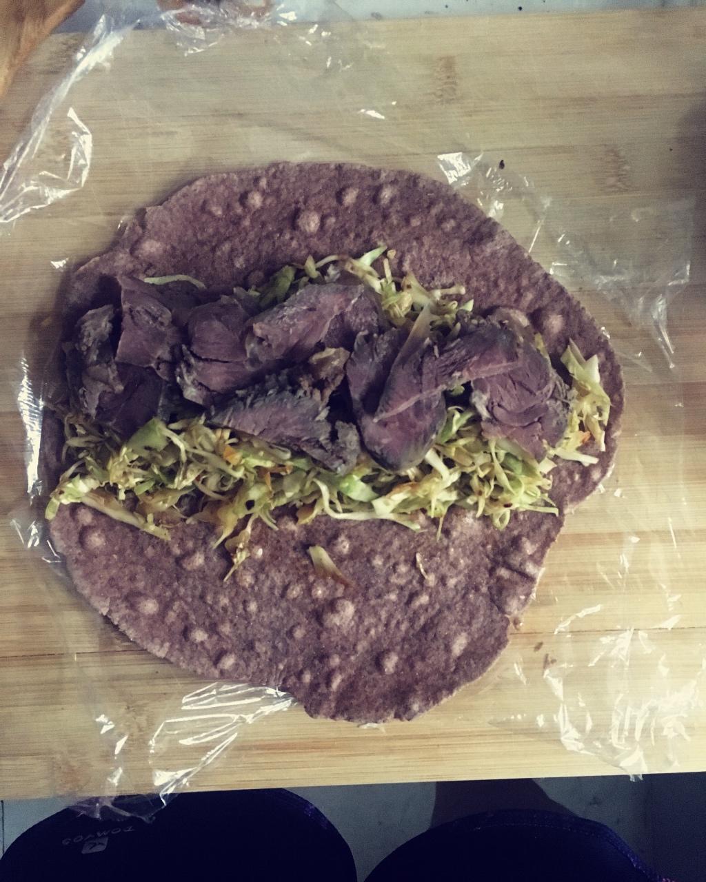 自制全麦饼➕卷心菜➕牛肉➕脱脂奶➕火龙果,自制减脂餐