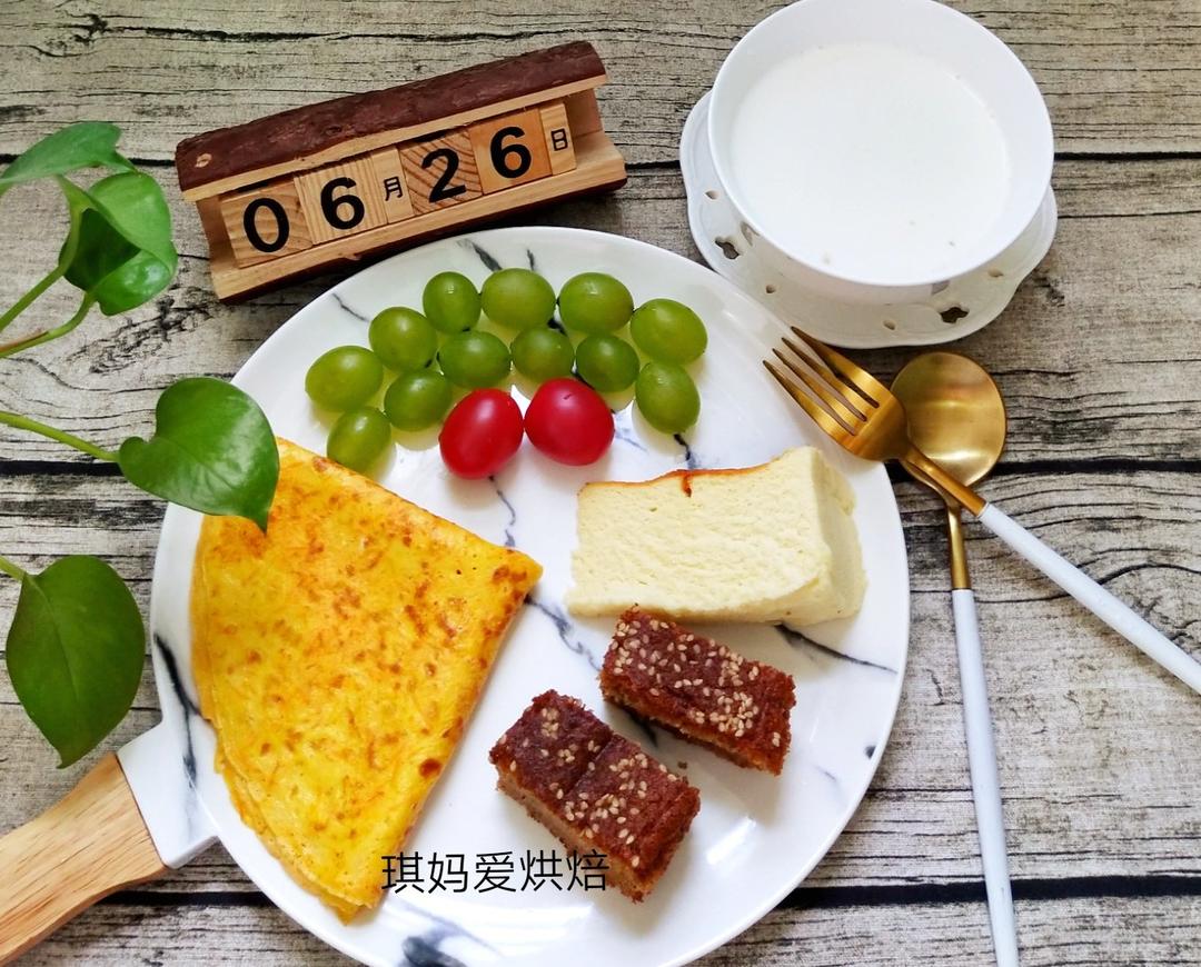 今日早餐——胡萝卜丝蛋饼,红枣蛋糕,榴莲芝士,水果,麦片牛奶😊