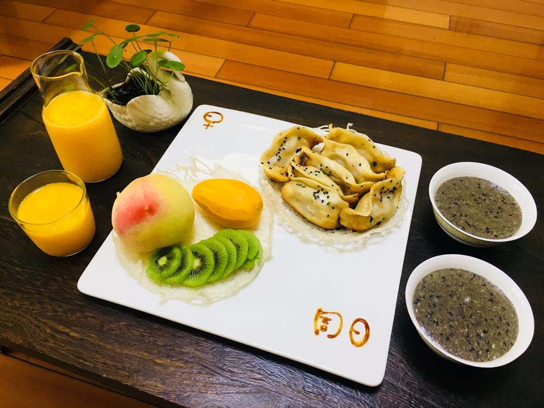 周日:窝在家里做个鸟窝锅贴,多余面酱继续做鸟巢放水果,昨日多余的黑芝麻馅做芝麻糊。