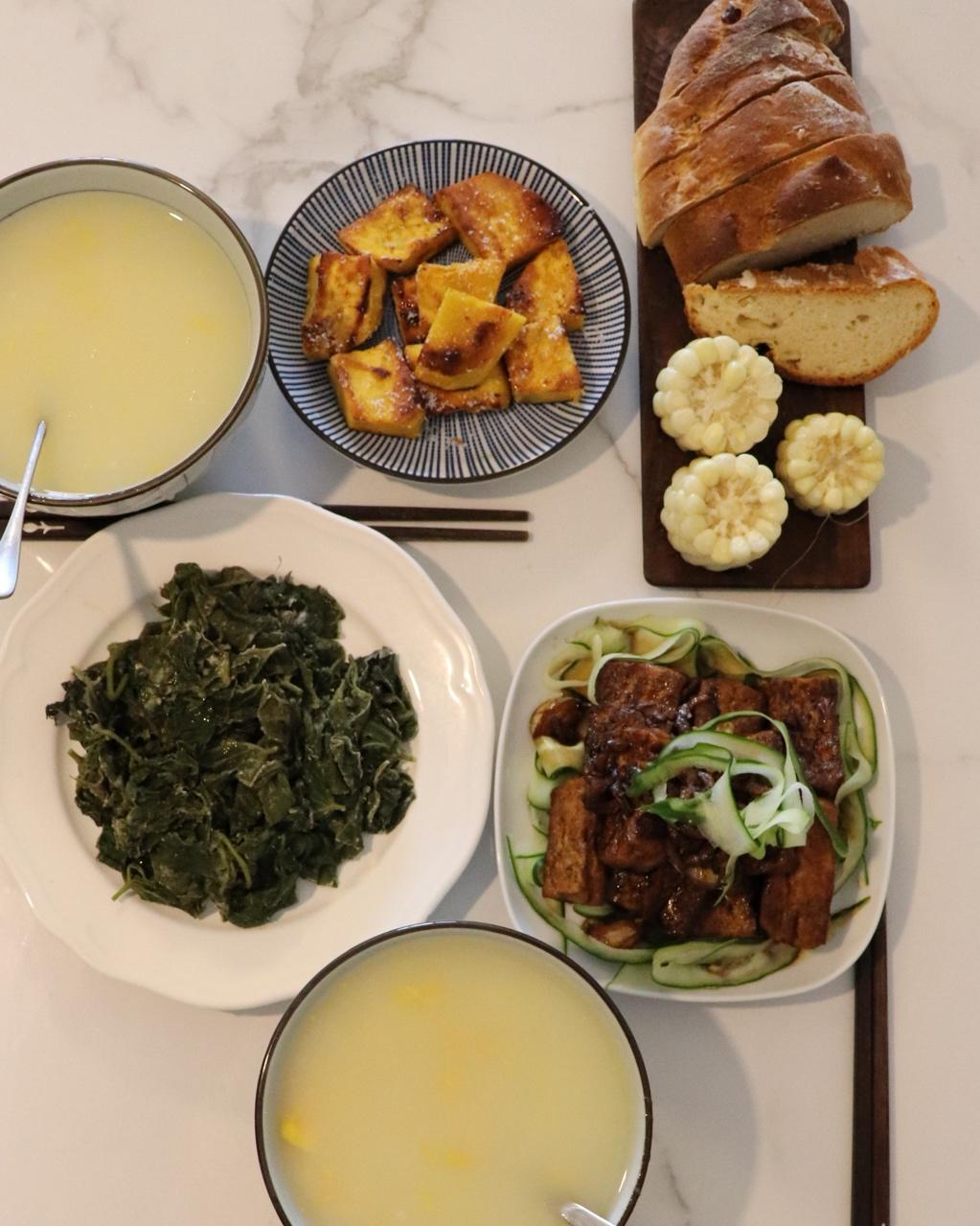 day 8 红薯汤 煎红薯 蒸红薯叶 烧豆腐 玉米面包
