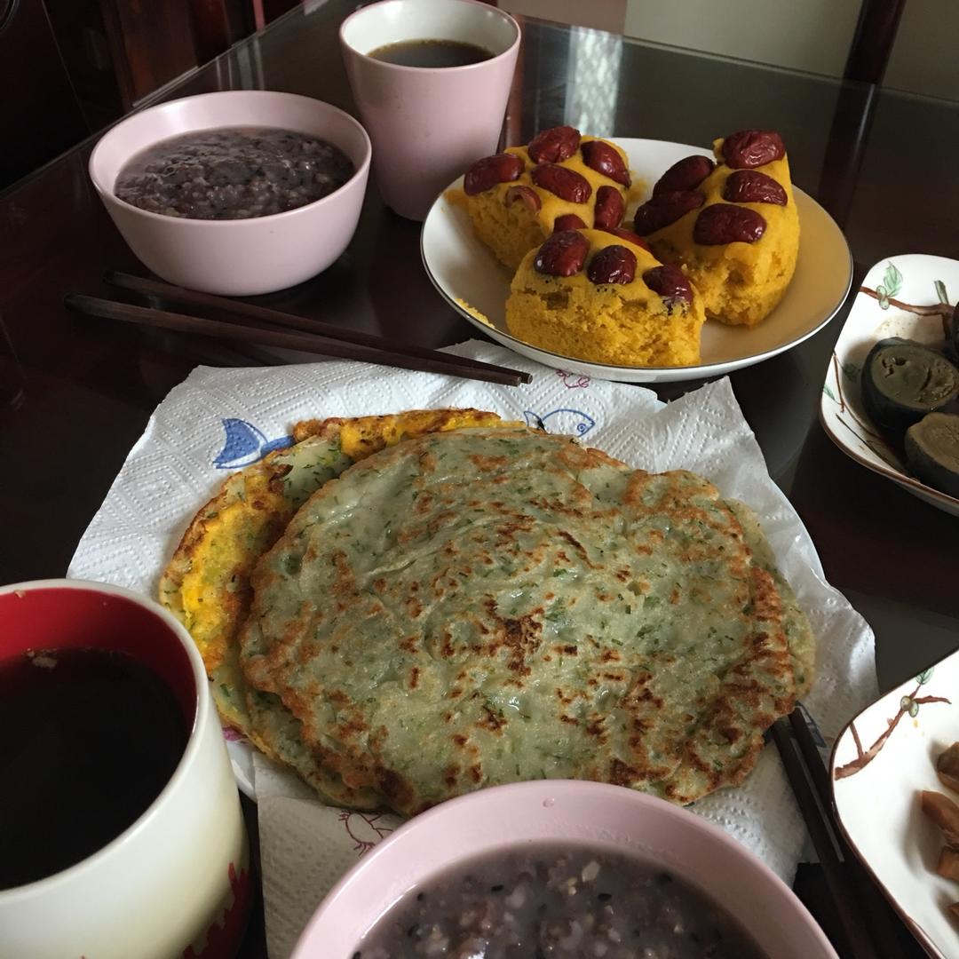 香葱鸡蛋饼(卖相不行啊🙈),红糖姜茶,杂粮粥