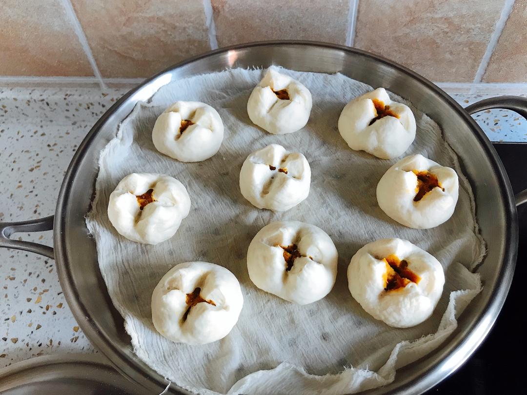 Mary沈 做过 2018年07月24日 南瓜奶黄包馅料:用300克小南瓜蒸熟后取瓤,加40克黄油小火炒掉水分分成15份备用皮:300克面粉(中筋)210克牛奶4克酵母发酵后排气,等分15份包入馅料用剪刀剪十字口二次发20分钟后凉水上笼大火蒸十五分钟后静置5分钟后开盖即可 2018-07-24
