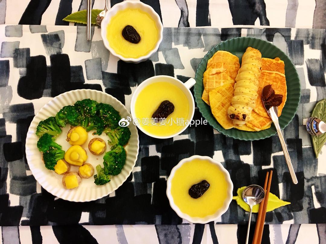 #美食每刻#周四,早上好!天气在晴和多云间切换!今天的早餐:西兰花+烤蘑菇,华夫饼+毛毛虫面包,玉米糊