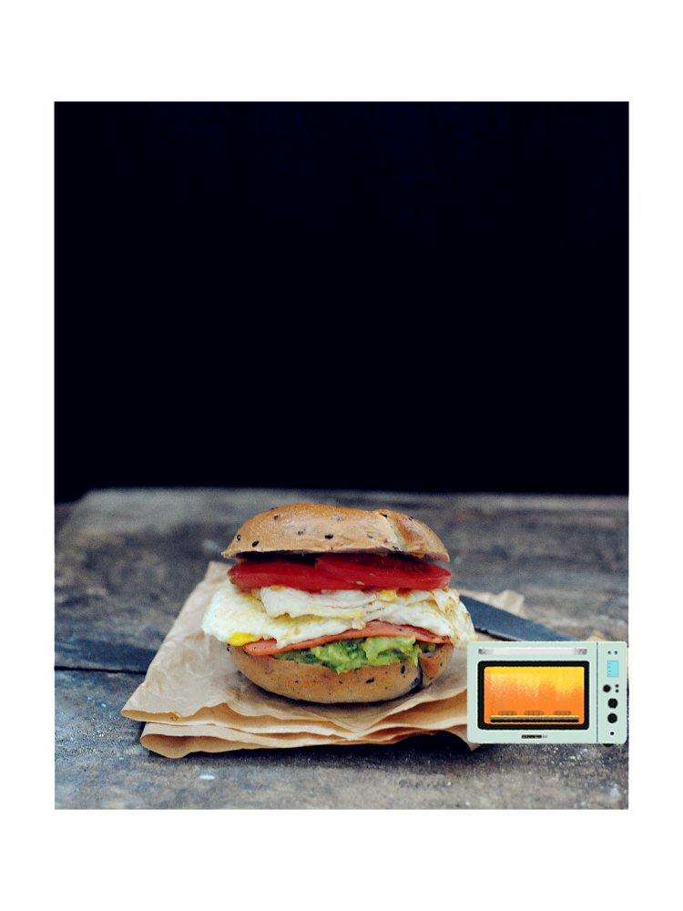 #早餐•2018年8月23日#【用早餐叫你起床】今日早餐:黑芝麻全麦紫薯贝果三明治~夹馅:牛油果酱,火腿片,煎蛋,西红柿~新尝试了一种牛油果酱,熟透的牛油果捣成泥,加海盐、黑胡椒、少许柠檬汁、香菜碎和香葱碎,味道不错