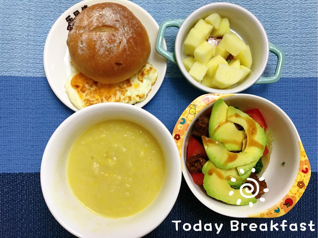 Lynn_SL 做过 早餐•2018年9月4日 🔅今日早餐🍽百合玉米糊+ 蔓越莓奶酪馅面包 + 煎鸡蛋 + 沙拉(牛油果、西兰花、香煎牛肉肠、圆生菜、西红柿)+ 苹果 + 牛奶 #早餐•2018年9月4日# 2018-09-04