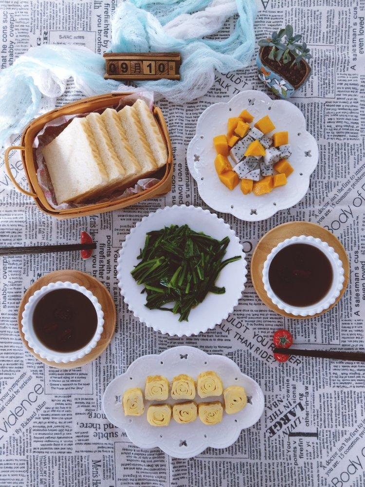 岁月静好_丽 做过 我只想和爱的人一起吃早餐 #早餐•2018年9月10日##乐享早餐##我用早餐叫醒你# 2018.9.10今日早餐:吐司面包、清炒油麦菜、厚蛋烧、黑米杂粮粥、水果。祝所有老师们节日快乐!🌹🌹🌹 2018-09-10