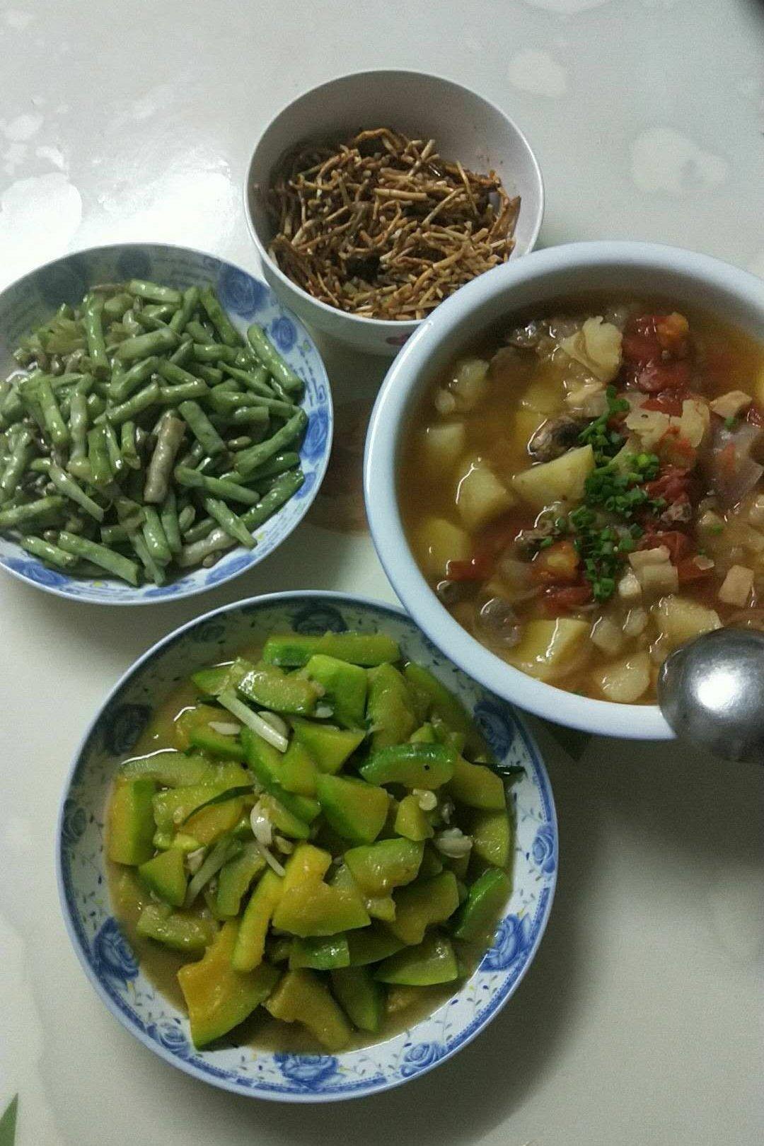 清炒南瓜、炒豆角、凉拌鱼腥草、番茄土豆炖牛肉