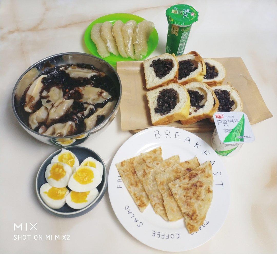 鲜肉水饺。。鸡蛋。。香蕉飞饼。。红豆面包。。柚子。。酸奶