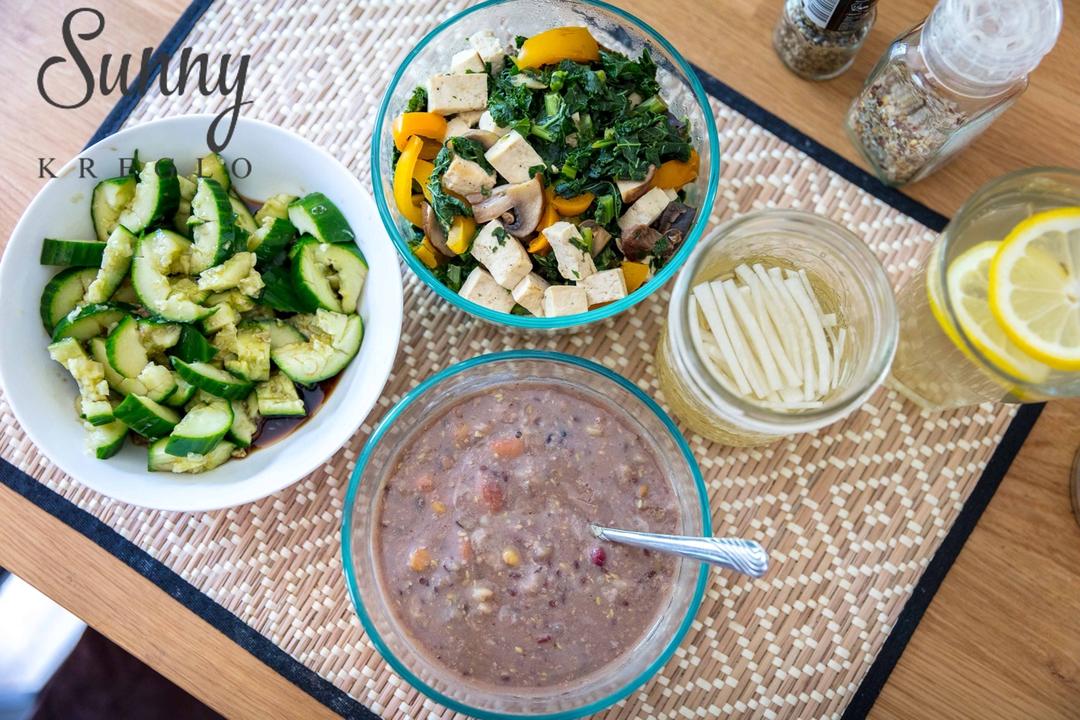 从北京回来的回归正轨粥,拍黄瓜,豆腐鸡肉猪里脊羽衣甘蓝甜椒,自己腌的酸酸的白萝卜丝。