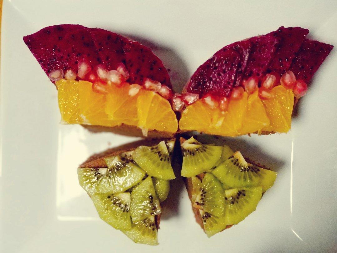 下刀切的时候切刀口切反了,但是拼一拼也是很像蝴蝶的😁。孩子不喜欢所以没有用奶油,完全版水果裸蛋糕。